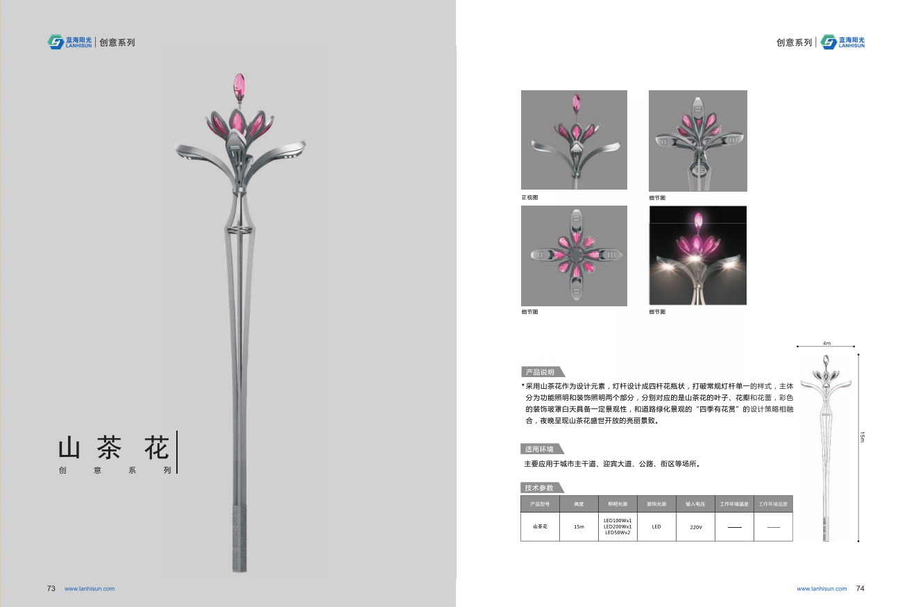 1、高度為6-16米; 2、花葉光源為4組LED光源,色溫2500-6500K,其余燈罩光源為LED裝飾光源,每個光源功率為30-60W; 3、LED驅動電源壽命可達五年; 4、整體熱鍍鋅噴塑,保證燈桿15年不生銹; 5、可以根據使用地區(qū)的地域文化、產業(yè)特點等進行文化定制;