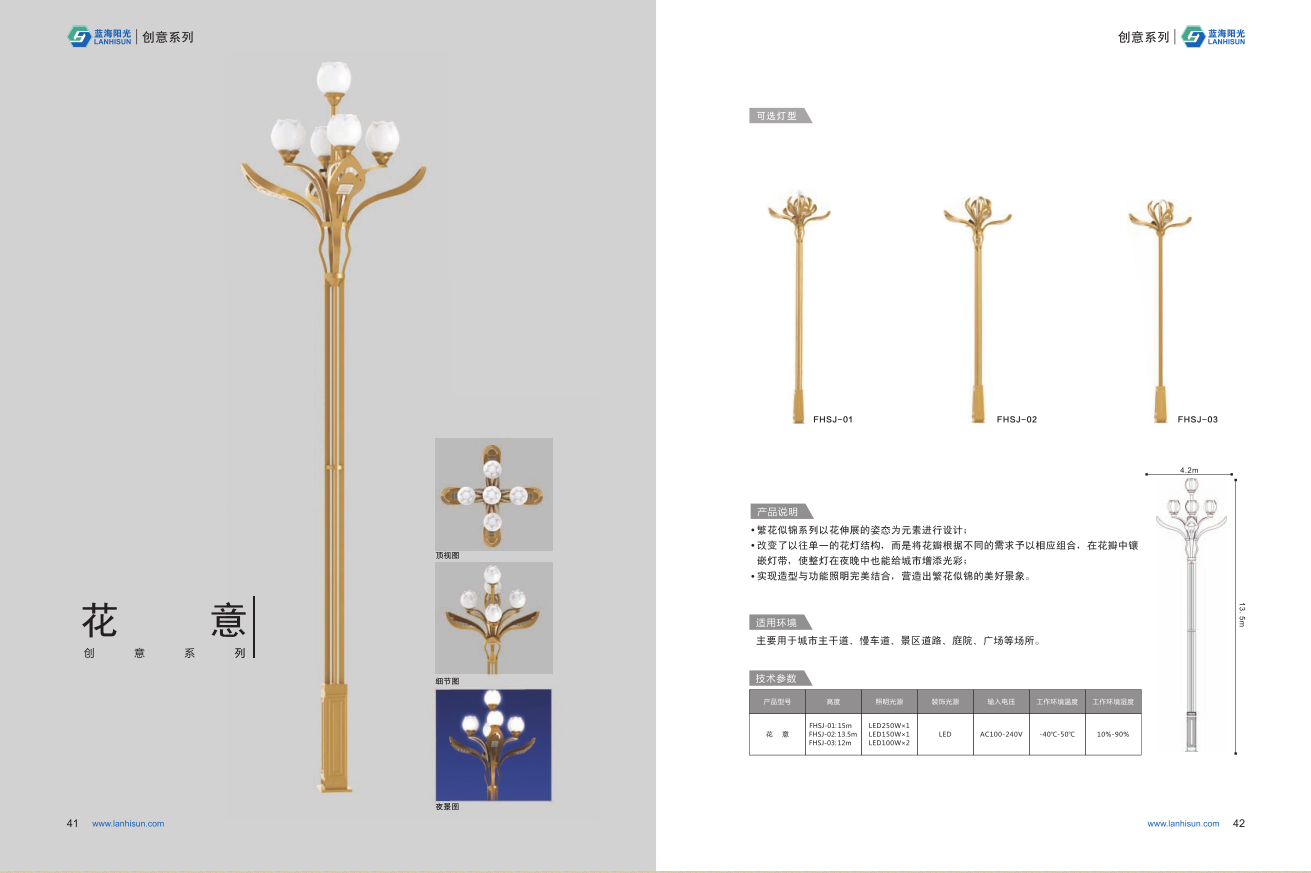 1、高度為6-16米; 2、花葉光源為4組LED光源,色溫2500-6500K,其余光源為LED裝飾光源,每個光源功率為30-60W; 3、LED驅(qū)動電源壽命可達(dá)五年; 4、整體熱鍍鋅噴塑,保證燈桿15年不生銹; 5、可以根據(jù)使用地區(qū)的地域文化、產(chǎn)業(yè)特點等進(jìn)行文化定制;